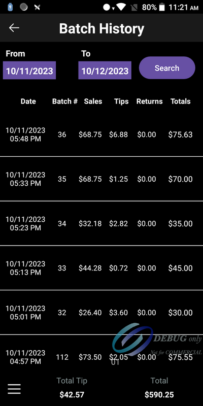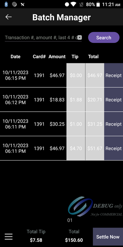 - Sau khi transaction được thanh toán sẽ được hiển thị ở đây - Có thể in lại receipt của appointment sau khi thanh toán - Có thể adjust Tip và Total - Hiển thị appointment chưa được settle - Không thể thực hiện thanh toán khi batch manager quá 3 ngày chưa được settle ### 3. Batch History