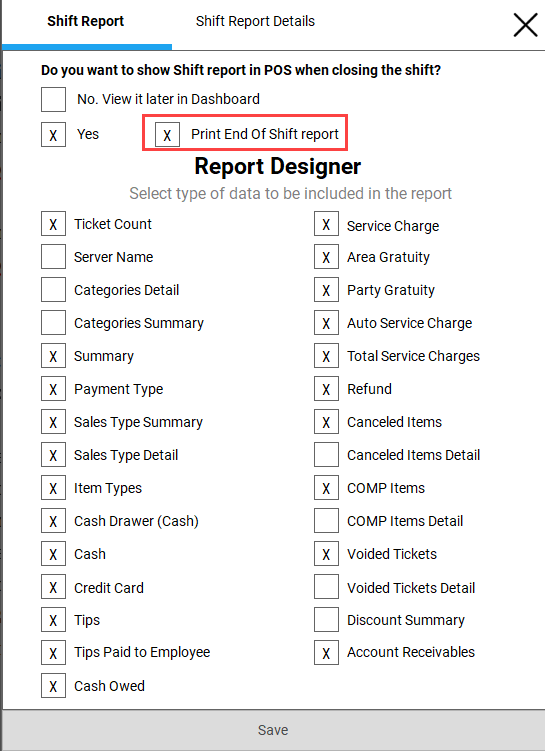 - Shifts report (BO & POS): shifts report and details