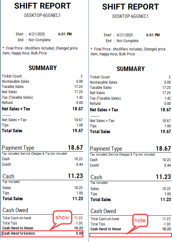 - Value =0: Không show dòng Cash Owed to [server name]