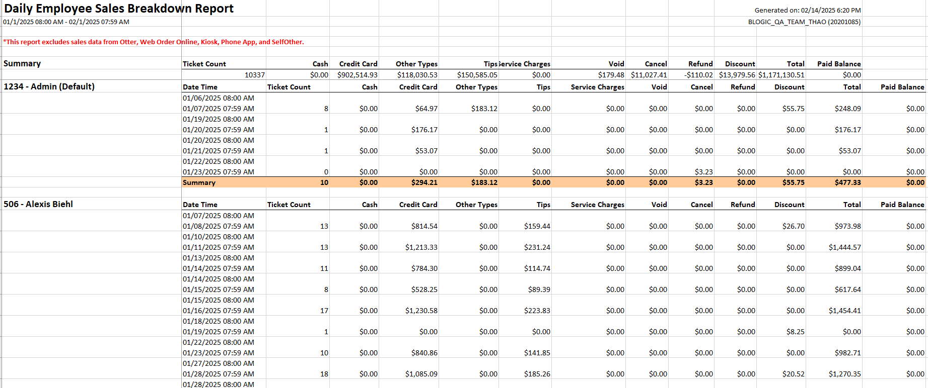 This report excludes sales data from Otter, Web Order Online, Kiosk, Phone App, and SelfOther.