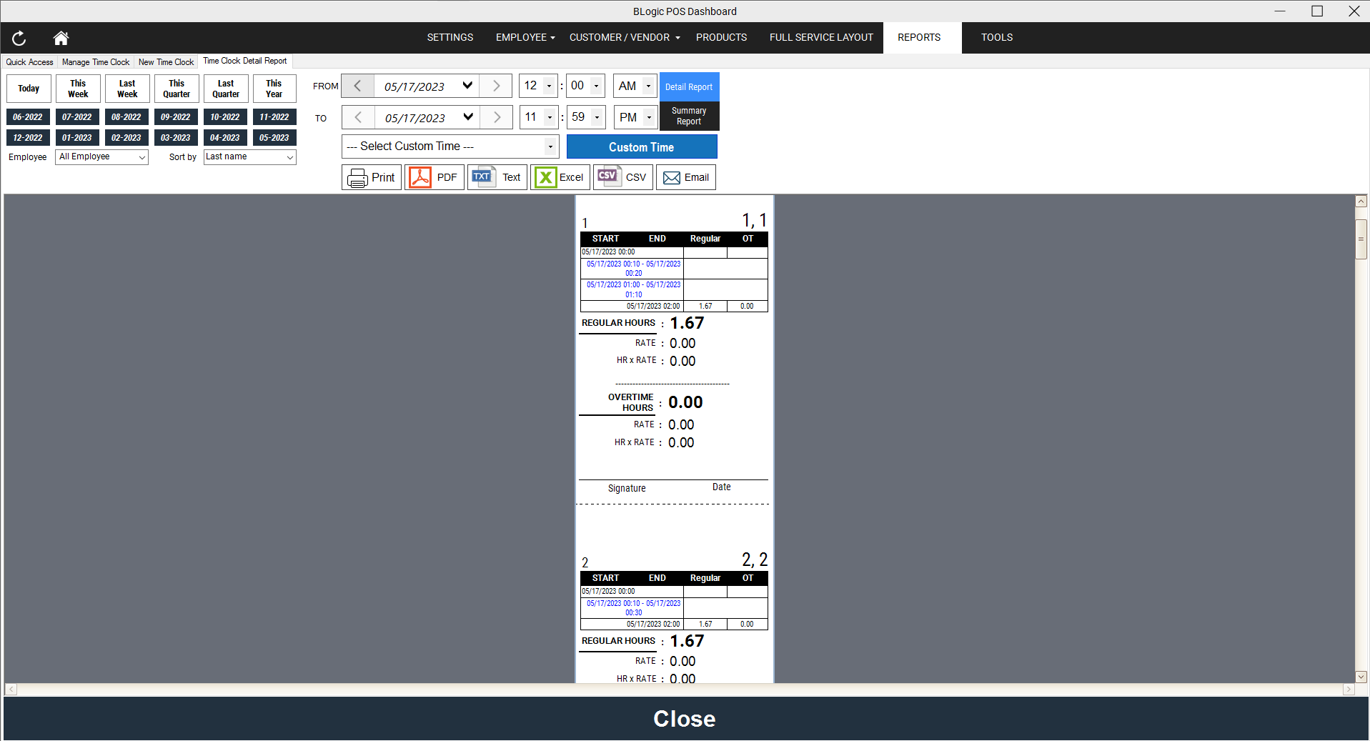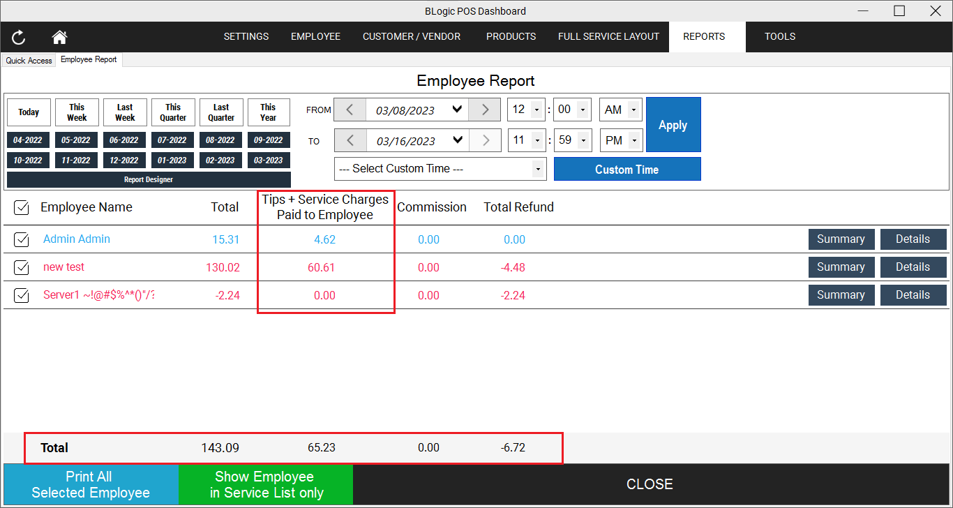 Employee report show thêm Service charges amount paid to employee chung với cột Tip nếu Config Service charges paid to Employee, đồng thời thêm Dòng Total bên dưới