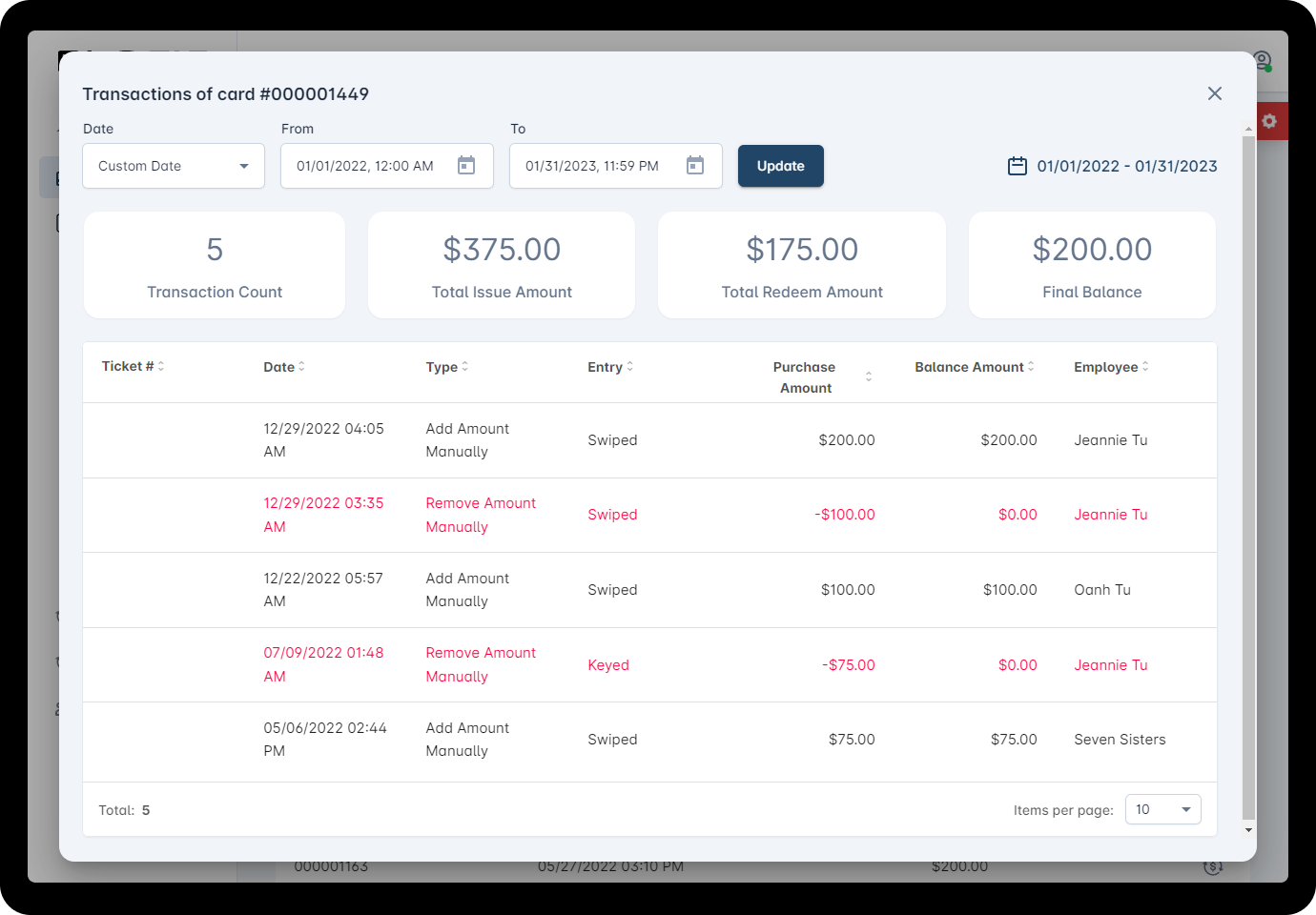 A complete record of all transactions for a specific gift card, including the date, time, and amount of each transaction, as well as the remaining balance on the gift card after each transaction.