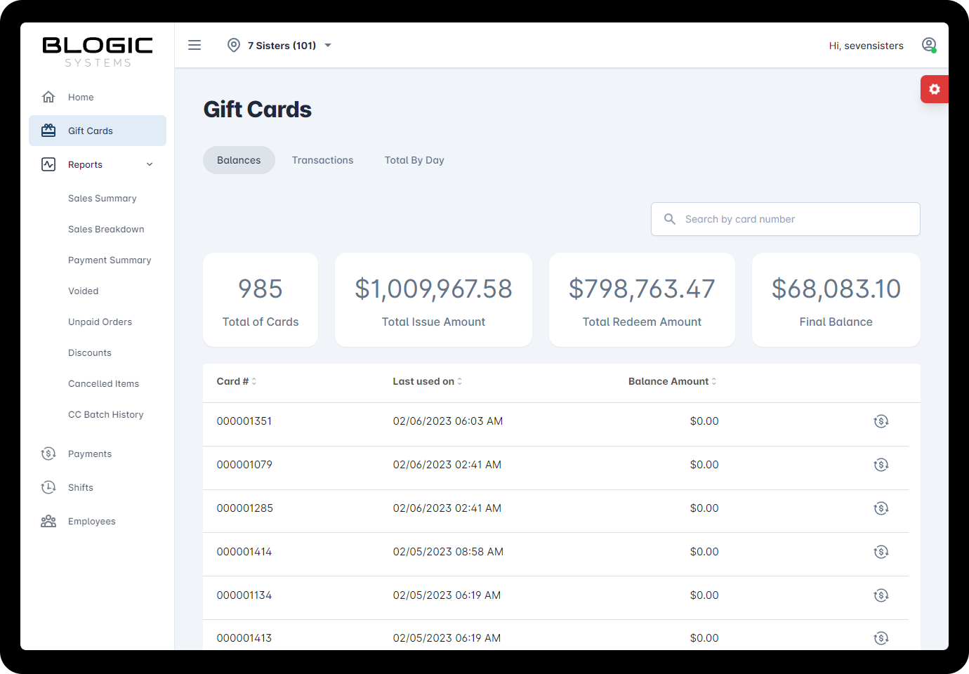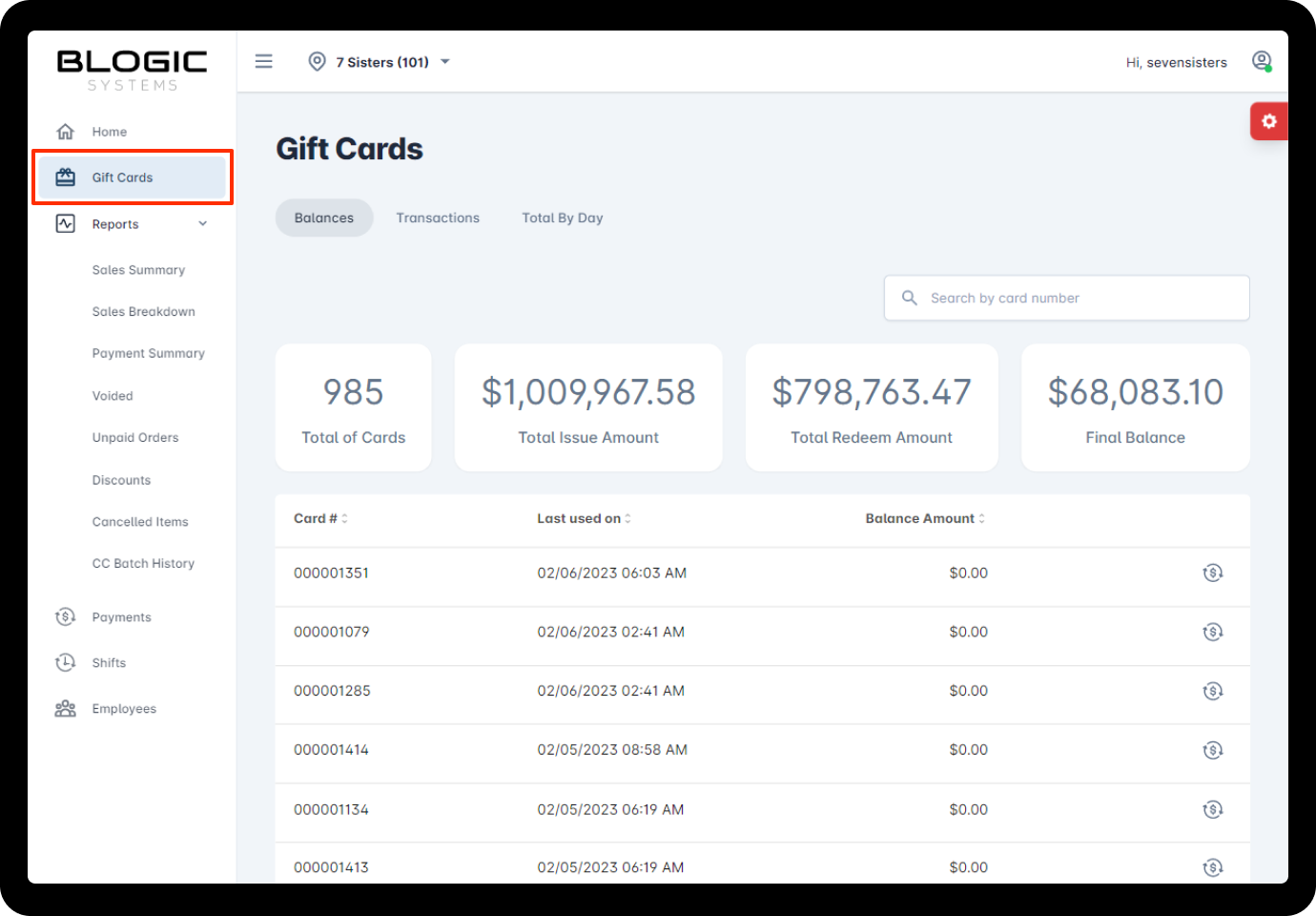 To view the transactions for a specific gift card, click on thedollar iconin theBalance Summary Report. {.is-info}