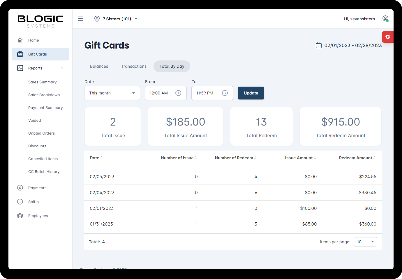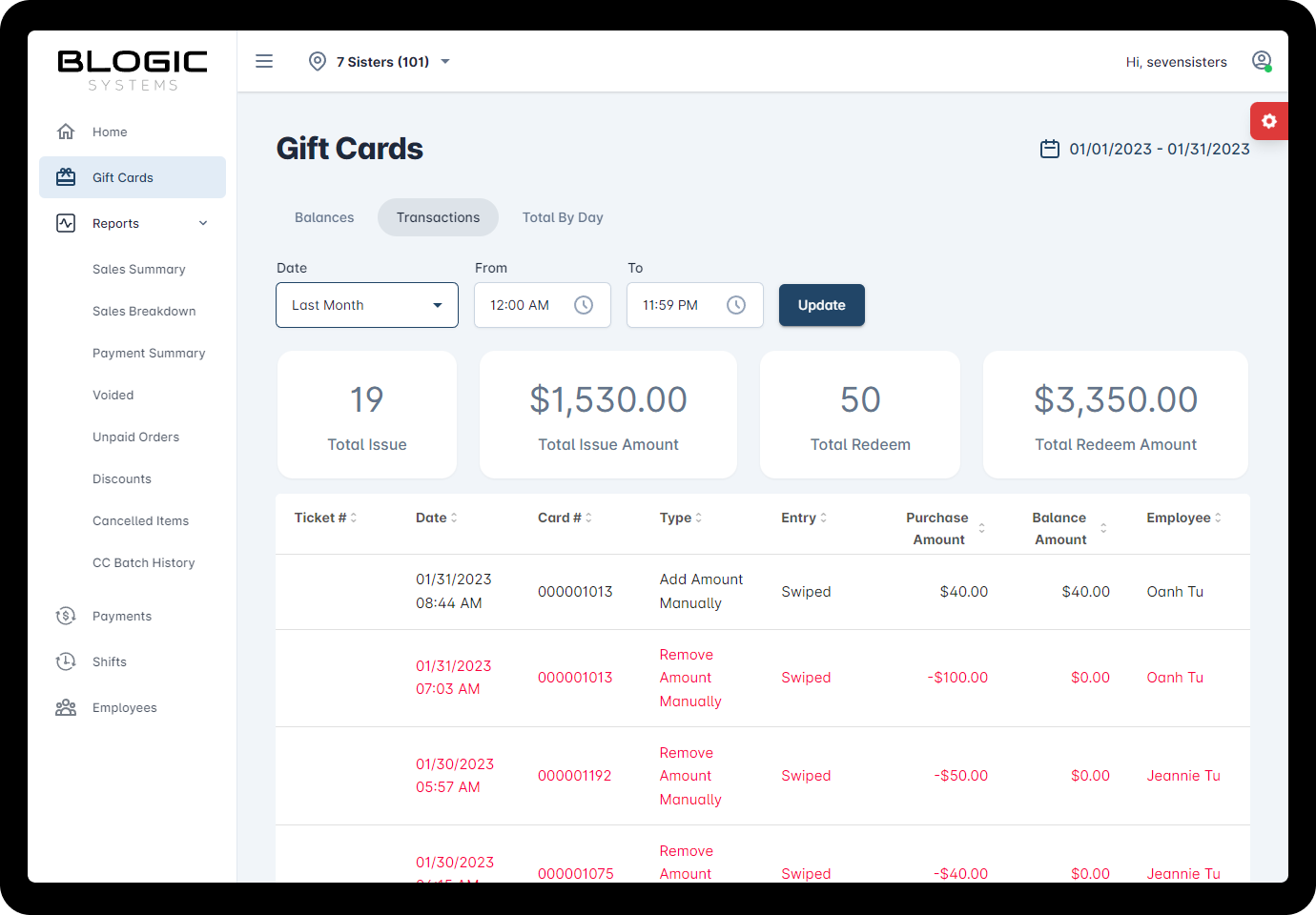 An overview of the total amount of money loaded onto gift cards, the total amount redeemed, and the total balance remaining on all gift cards.