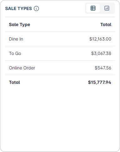 Provides a breakdown of the different types of sales. Sale types can include dine in (in-store sales), to go (take away sales), online ordering, or other types of transactions.