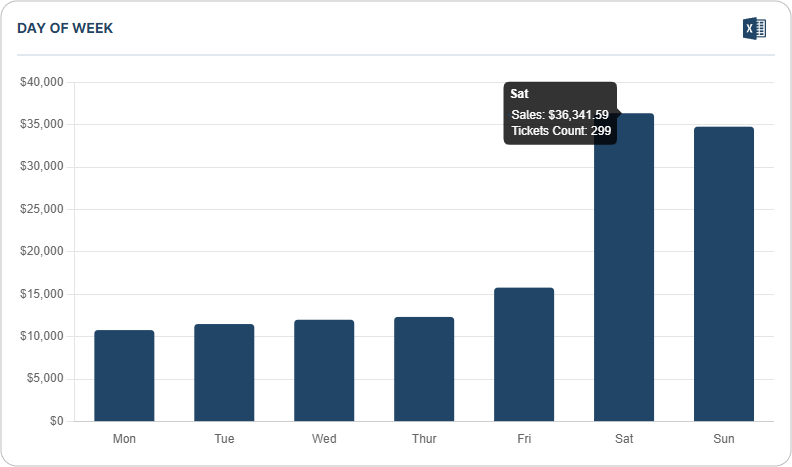The revenue chart by day of week is a bar chart, each bar represents the revenue on a particular day.