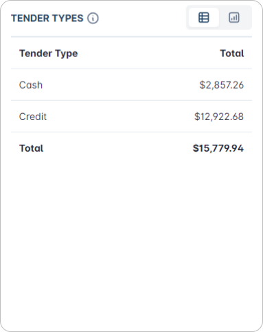 Provides a breakdown of the different payment methods used by customers. Tender types can include cash, credit card or other forms of payments.