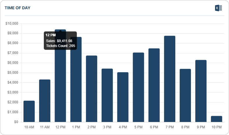 It displays the revenue at different times of the day. It is useful for understanding the patterns and trends in a business’s revenue, such as the busiest times of the day and the slowest times. This information can help businesses make informed decisions about staffing levels, promotions, and other factors that may impact revenue.