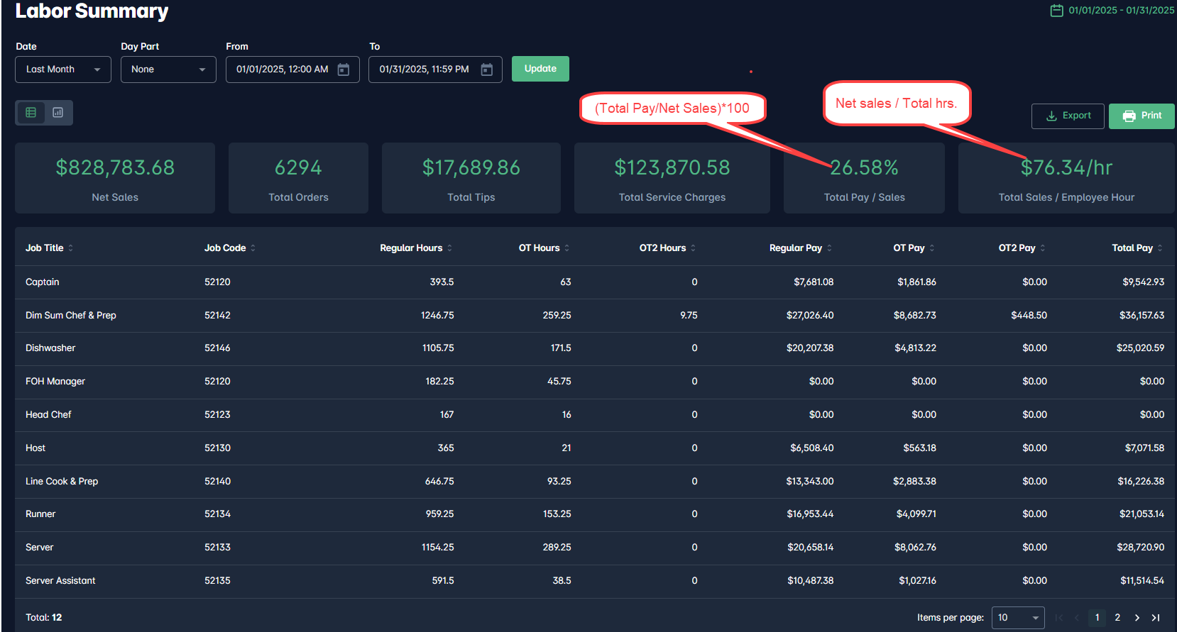 + Total Net sales / employee hrs. = Net sales / (Regular hrs. + OT hrs. + OT2 hrs.)- Data gridview