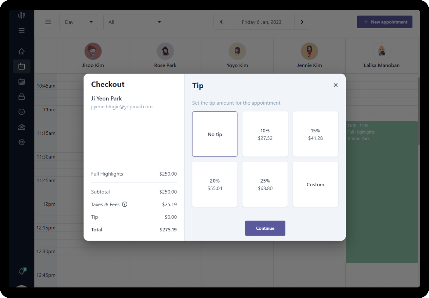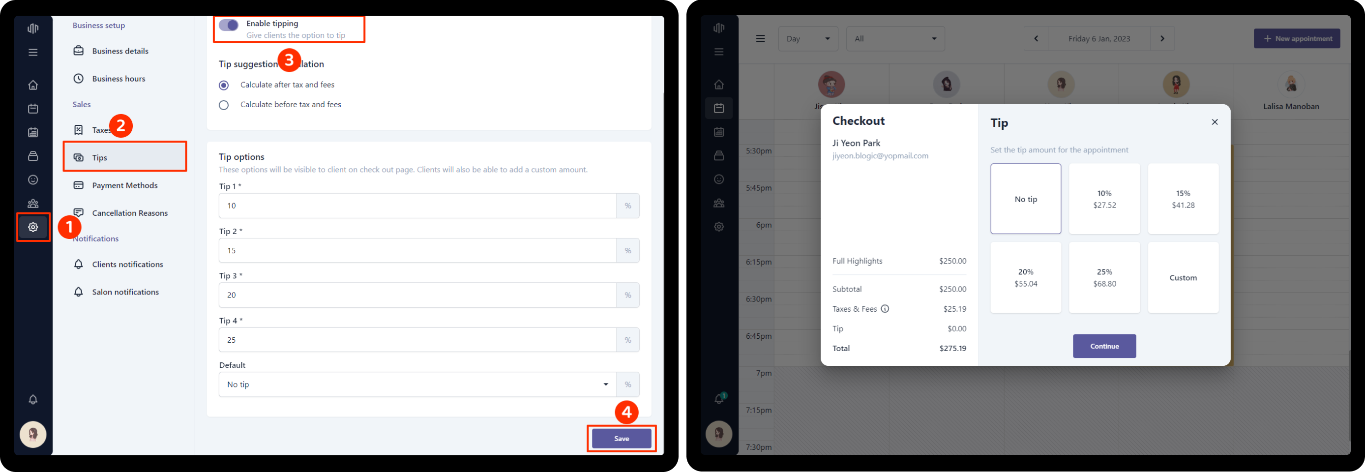 The tip suggestion values are default options. Clients will also able to customize the amount they’d like to tip by selecting Custom amount {.is-info}