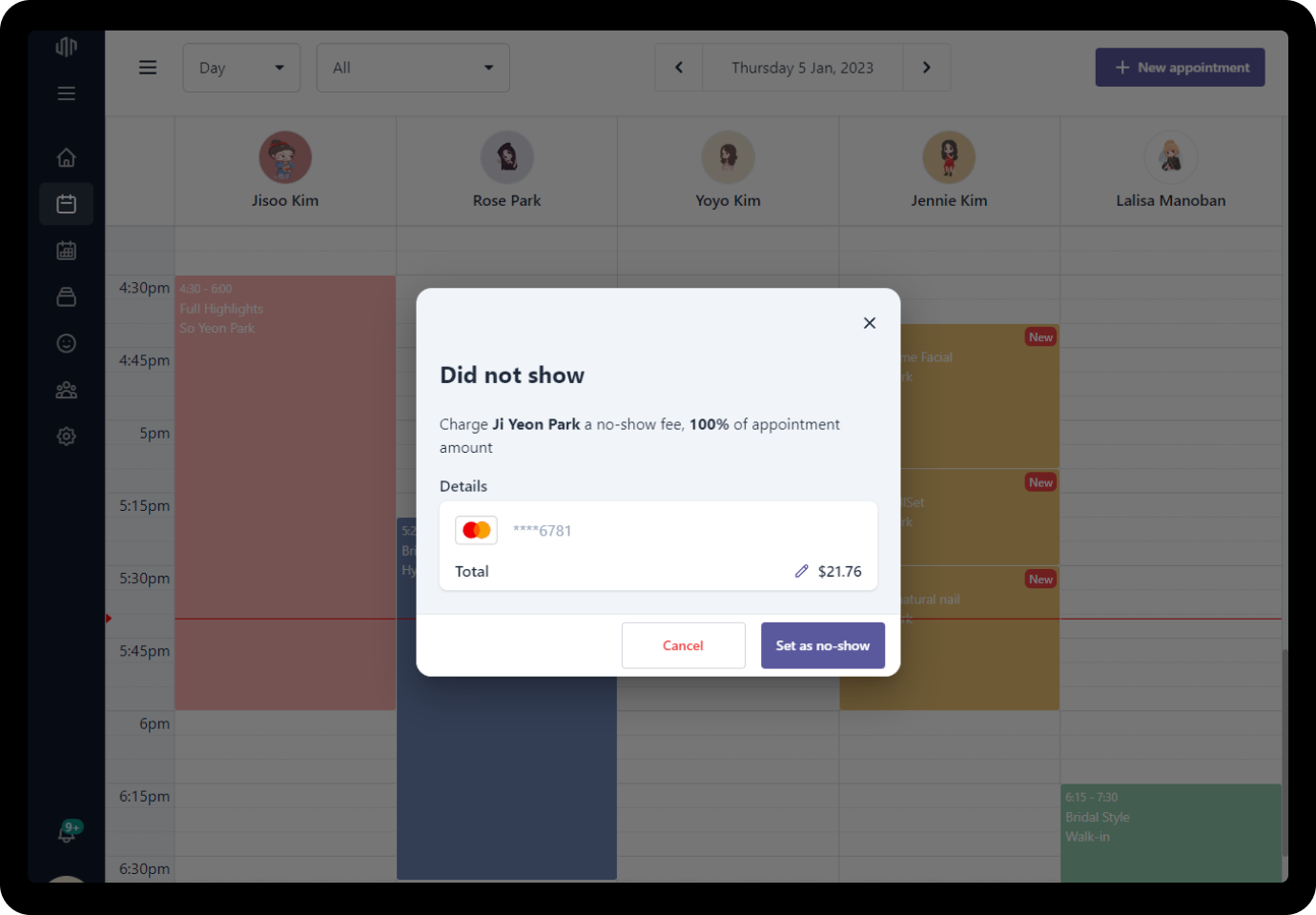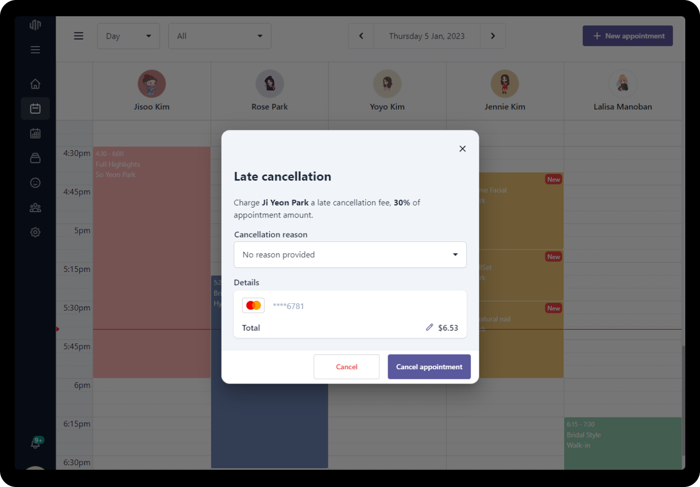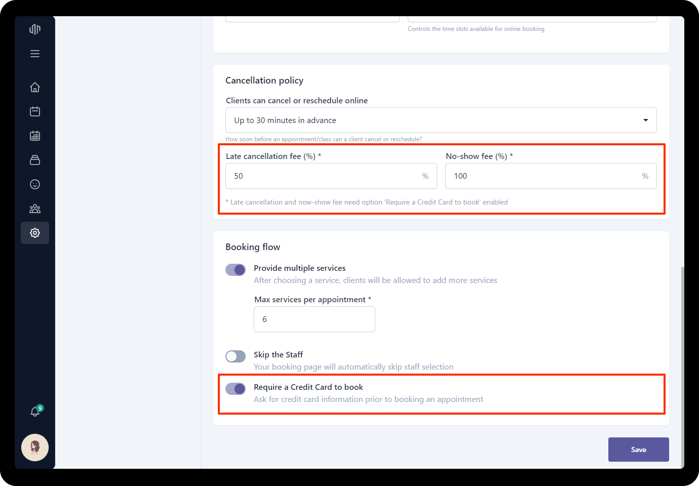 Late cancellation & no-show appointments: - To charge for late cancellation & no-show appointments, the option Required Credit Card to book must be enabled, appointments must be book by clients with credit card info - To charge for late cancellation, appointments must meet the requirement of late cancellation policy (see at Setup/Online booking/Cancellation policy) and the option Late cancellation fee must greater than 0. - To charge for no-show, appointments start time must pass the current time and the option No-show fee must greater than 0.
