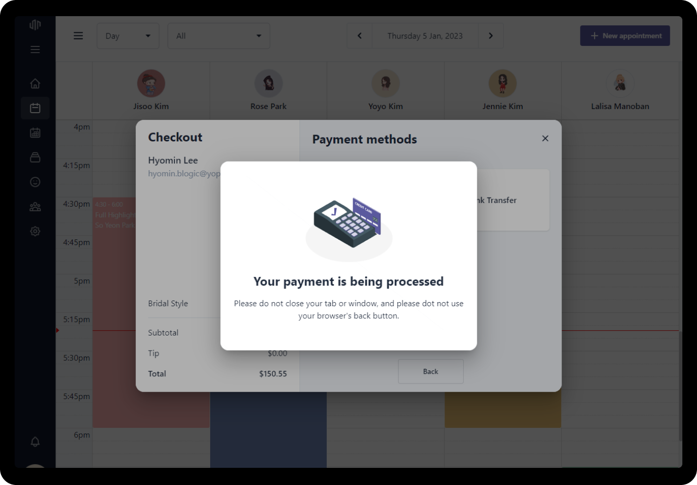 Credit Card payment notes: - To using credit card payment. Salon owner have to contact us to setup Authorize.Net gateway - The option Required Credit Card to book must be enabled - The appointment must be booked by clients. Because clients are the person who input their credit card info