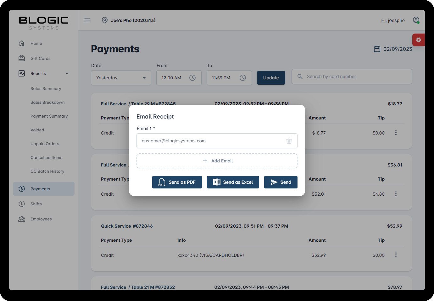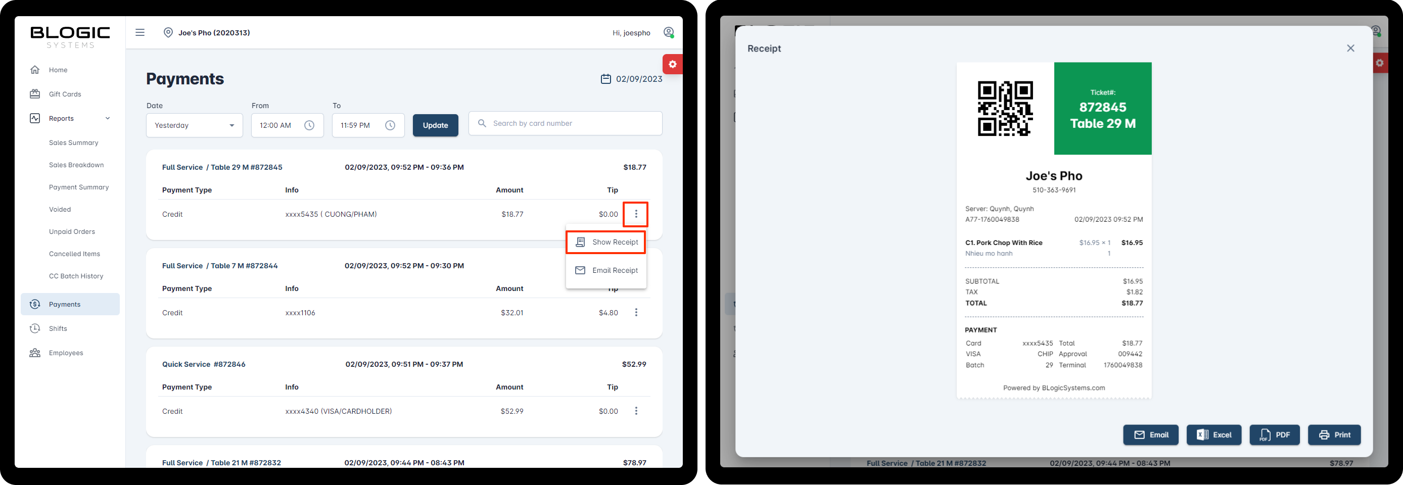 Show Receiptoption. - Review the sale receipt. A pop-up window or separate page should display the sale receipt, showing you a detailed list of items, tips, fees, taxes, and payment methods associated with the order.