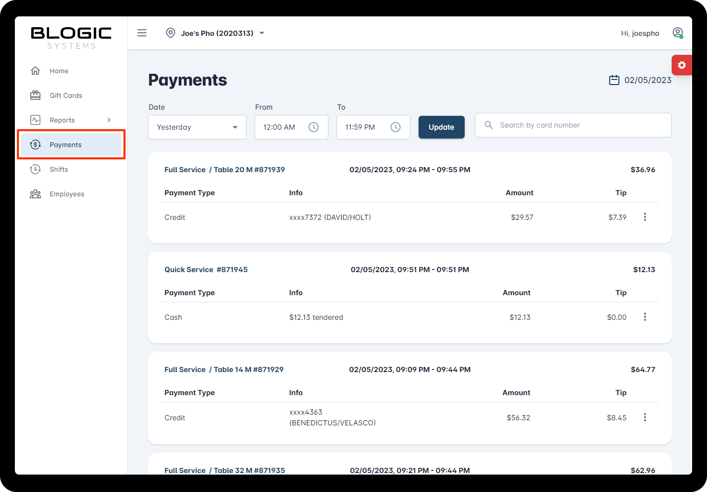 - Record of all the payments: Supports the ability for a single order to be paid multiple times with different credit cards, different method. Including the payment method type (credit card, cash or others), the credit card number used, the amount paid.
